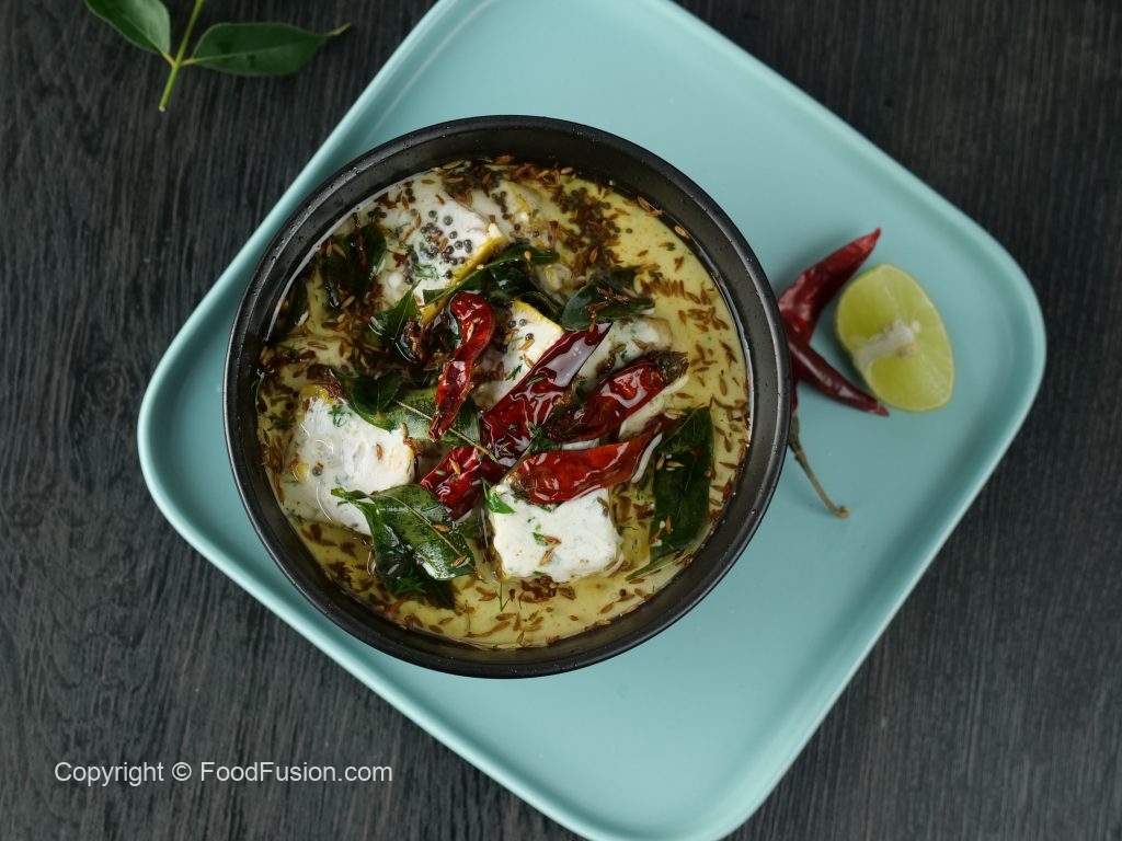 -Add gram flour cubes in prepared yogurt mixture,mix gently & set aside.