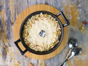 -Garnish with almonds,pistachios,silver edible leaf & refrigerate until chilled!