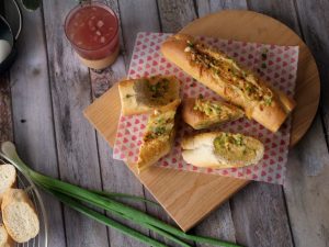 Place French baguette on a baking tray lined with butter paper & grease with butter.
