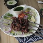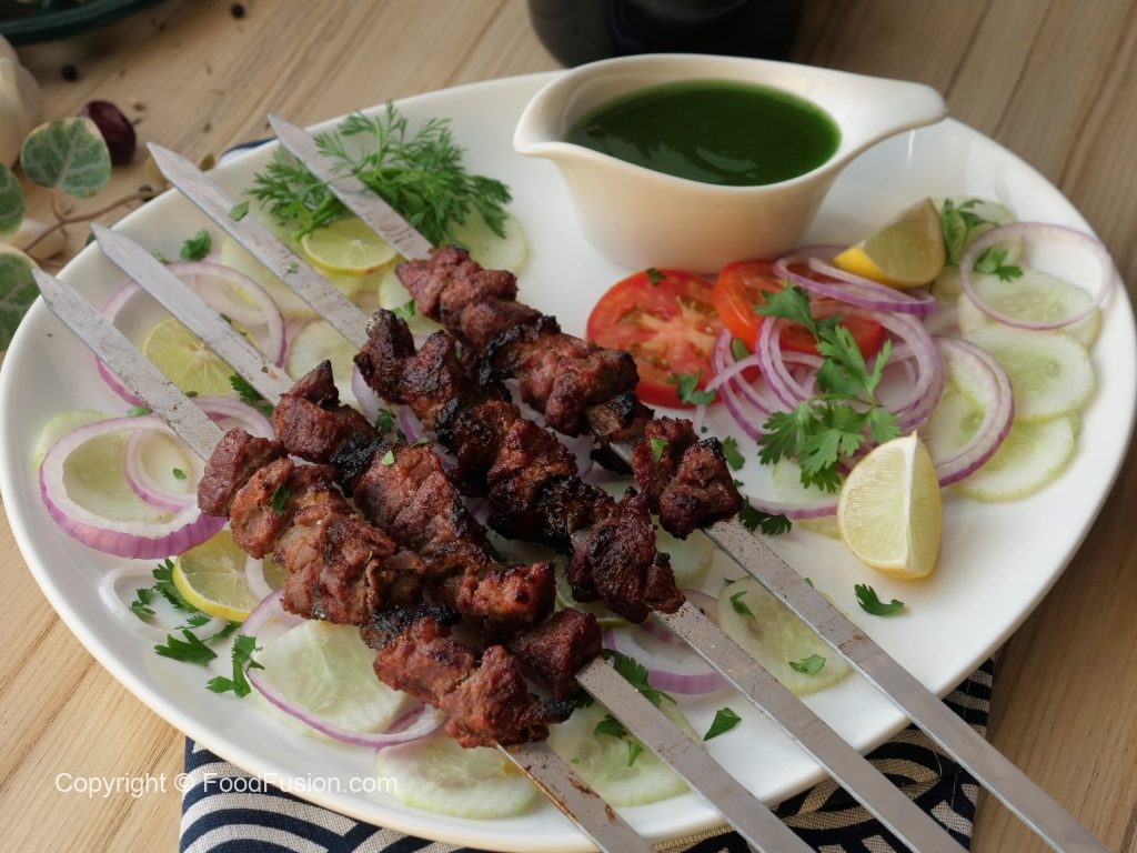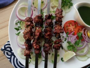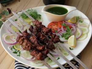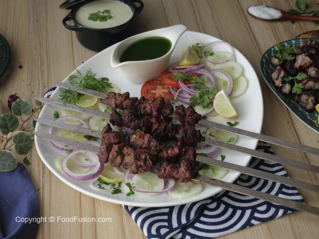 Serve Beef afghani boti with salad, raita & green chilli sauce.