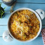 Add & spread half quantity of boiled rice,reserved gravy,steam cooked beef pieces,fresh coriander, mint leaves,fried onion and remaining quantity of boiled rice.