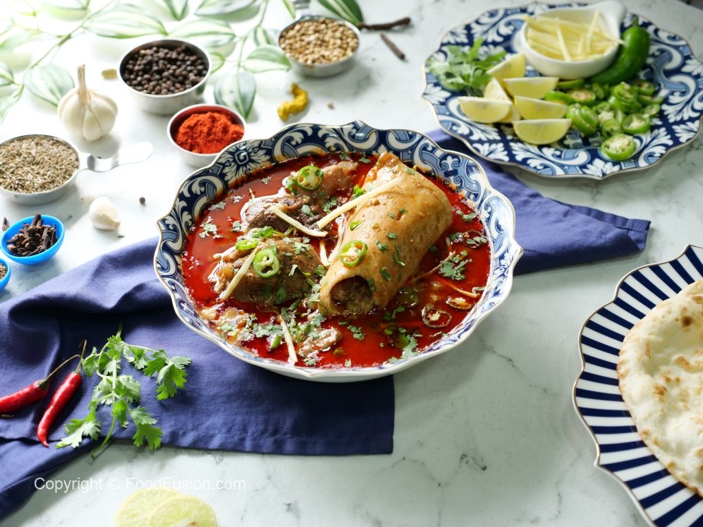 -Pour reserved oil (tarri) on nihari,garnish with green chillies,fresh coriander,ginger & serve with naan!