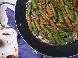 -Frying pan mein cooking oil aur stuffed bhindi dal ker halki acch per 12-15 minutes kliya paka lein & side per rakh dein.