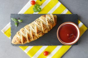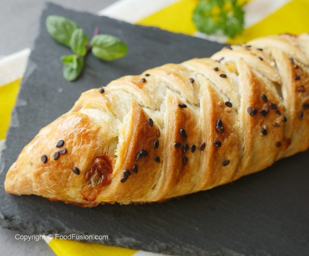 Braid ki tarhan overlap kertay hoye bread ka cuts ko alternately bundd kertay jayein (makes 4-5).