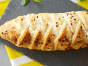 With the help of the brush,apply egg on braided bread and sprinkle black sesame seeds.