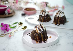 -Add prepared caramel sauce & pull all the sides of brownie along with cling film to wrap & make a round ball shape.