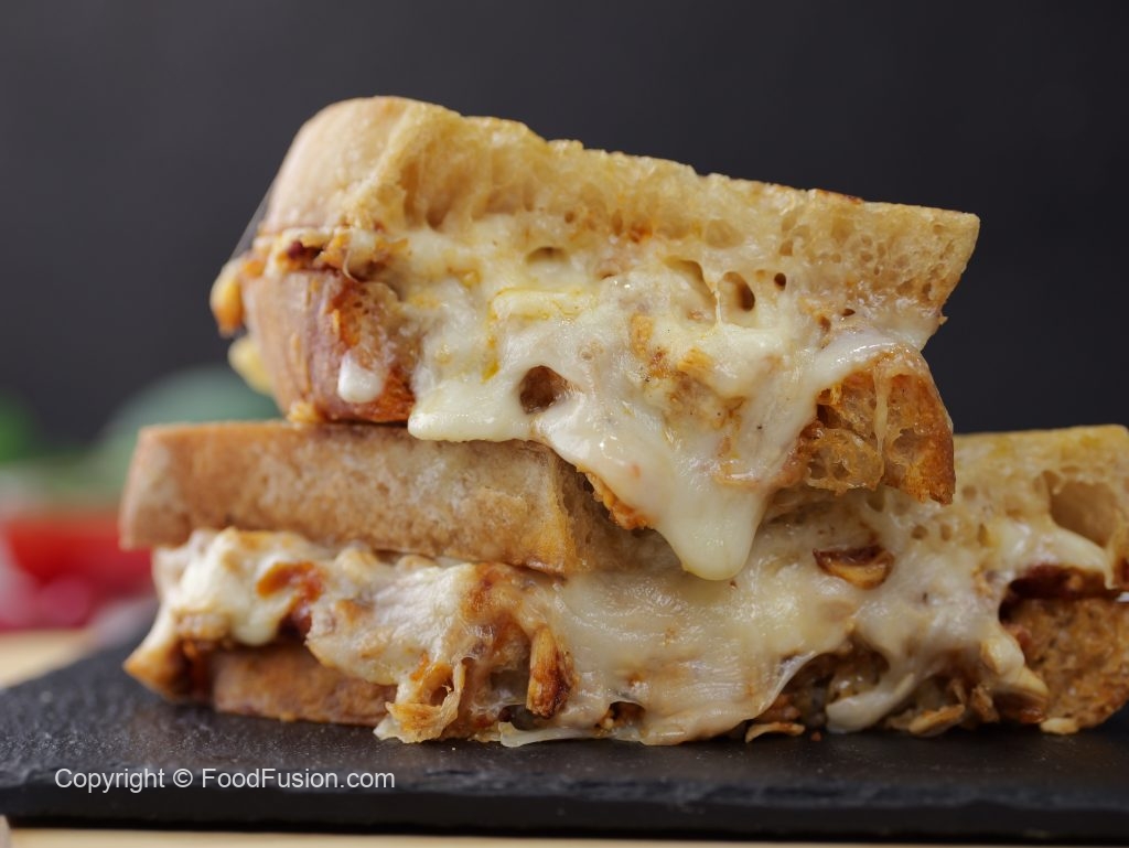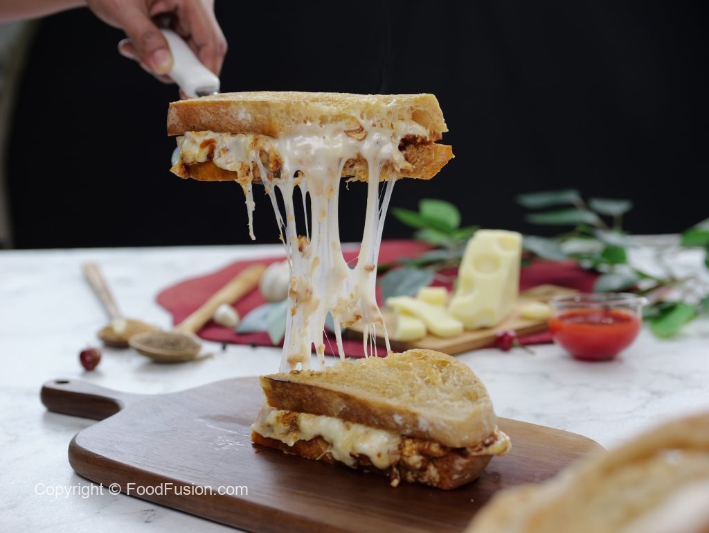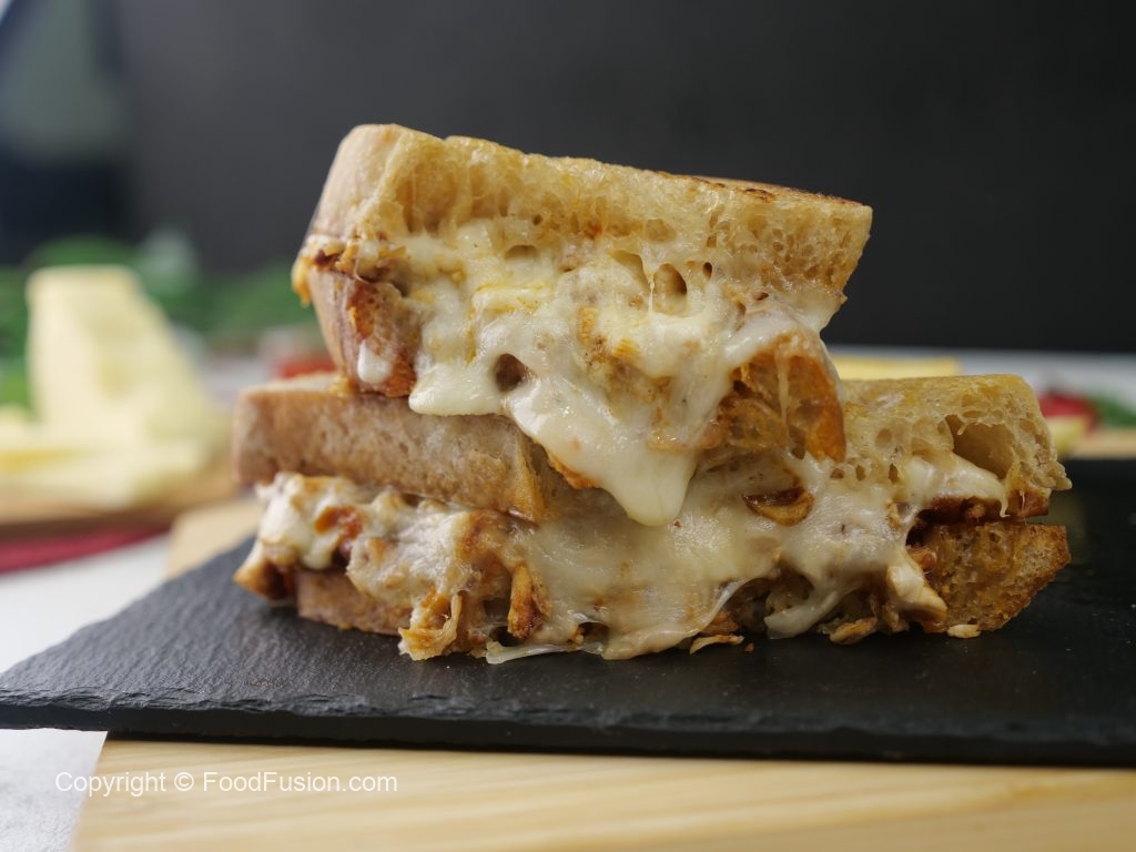 -On toasted sour bread slice,add melted chicken & cheese & top with another bread slice to make a sandwich (makes 4-5 sandwiches).
