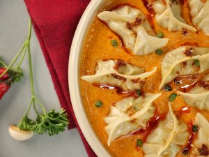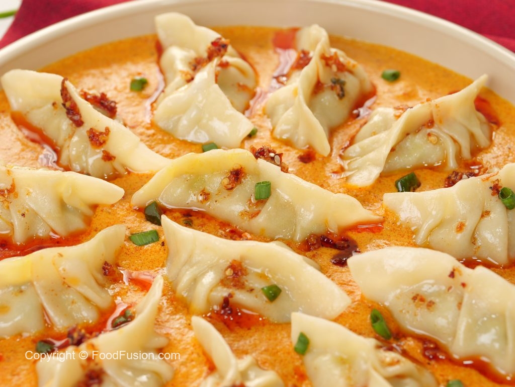 -On serving plate,pour prepared butter chicken sauce,place prepared dumplings,pour chilli oil,green onion leaves & serve!