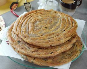 -Ghee dal ker pheela lein,lehsan,tayyar spice mix aur hara dhania dal ker paratha ko vertically fold ker ka roll ker lein.