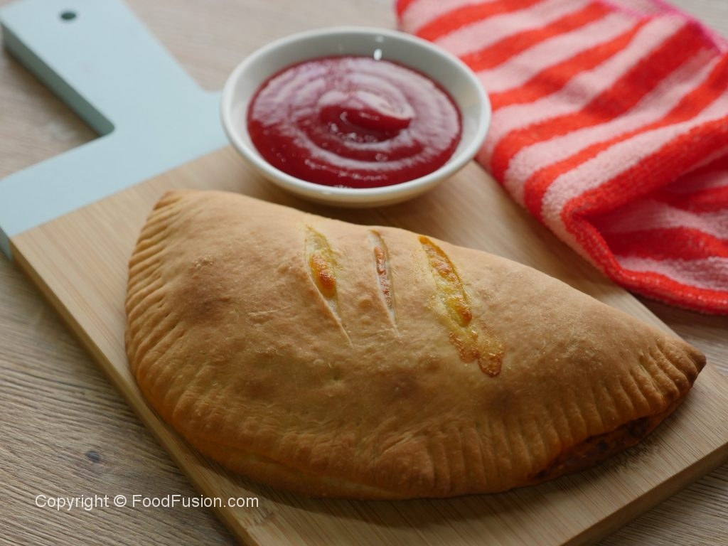 Baking dish per tayyar calzone rakh ker oil sa grease ker lein aur knife ki madad sa surface per marks laga lein (makes 4).