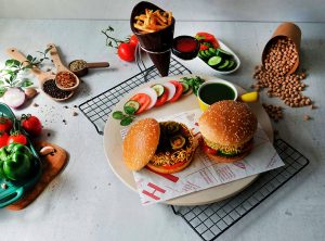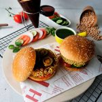On a burger bun,add & spread green chilli sauce,add tomato,cucumber,fried patty,jalapeno slices & drizzle tamarind sauce.