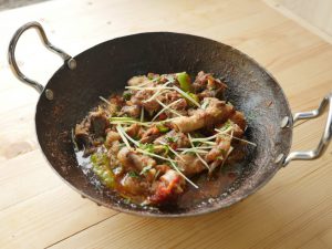 In wok,add mutton with bones,fat and salt.
