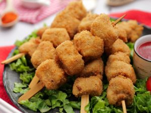 -Coat chicken skewers with all-purpose flour then dip in whisked eggs & coat with breadcrumbs.