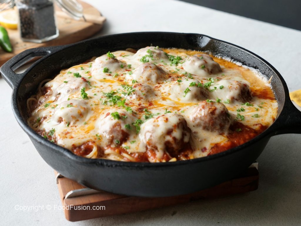 Tayyar meatballs ko sauce ka saath dal dein,cheddar cheese,mozzarella cheese aur lal mirch crushed dal dein aur dhak ker halki ancch per cheese melt ho janay tak paka lein (4-5 minutes).
