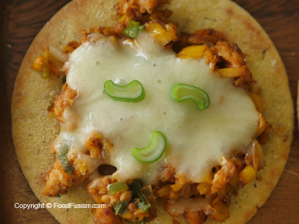Chulha bund ker dein,tayyar chicken corn filling,mozzarella cheese aur cheddar cheese rakh dein.
