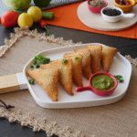 Pani laga lein,cheese slice aur tayyar chicken filling (1 tbs) rakh dein aur fold ker ka triangle shape bana lein aur edges ko press ker ka properly seal ker lein (makes 20-22).