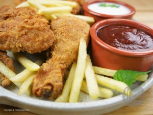Serve with French Fries, Dinner Rolls and garlic Sauce.