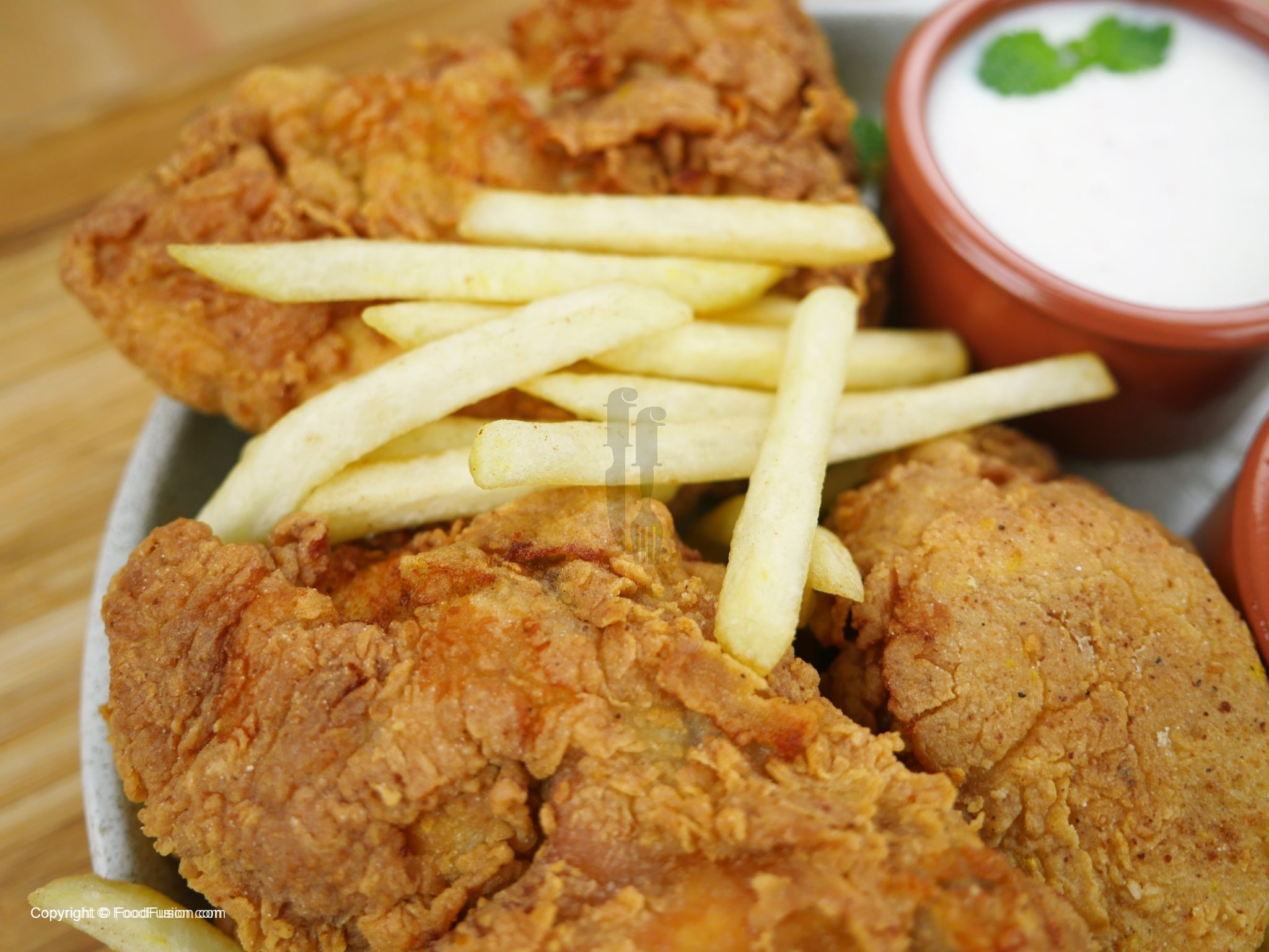 Jab chicken ka marination waqt mukammal hojaye to chicken ko pehle maida ke mixture phir phenta hua anda aur doodh ka mixture main dip karein and akhir main phir maid aka mixture main coat kar lein. Zada der nahi rakhein aur jald oil main daal ke fry karein warna crisp coating nahi hogi. Low-medium aanch pe chicken ko fry karein. Zada nahi rukh badlein warna coating utar jayegi.
