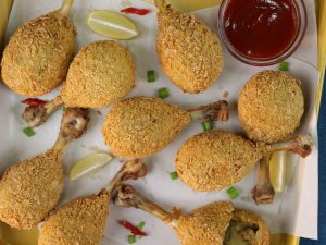 -Coat chicken drumsticks with all-purpose flour,dip in whisked eggs then coat with cornflakes.