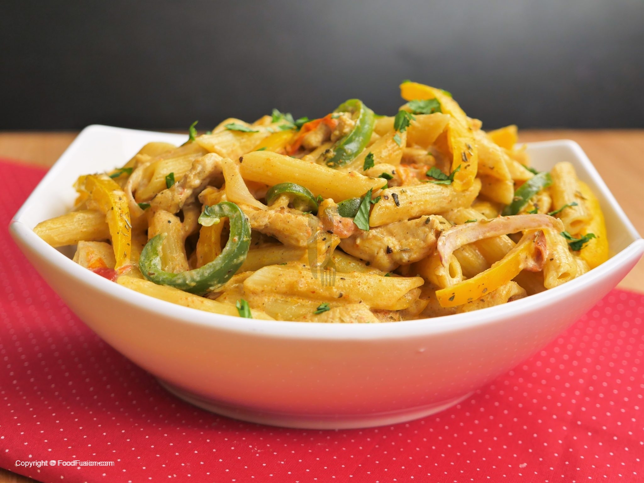 -Karhai mein oil,tamatar,fajita seasoning dal ker tamatar naram hunay tak paka lein,cooked chicken, penne pasta cooked aur vegetables dal ker ache tarhan mix ker ein.