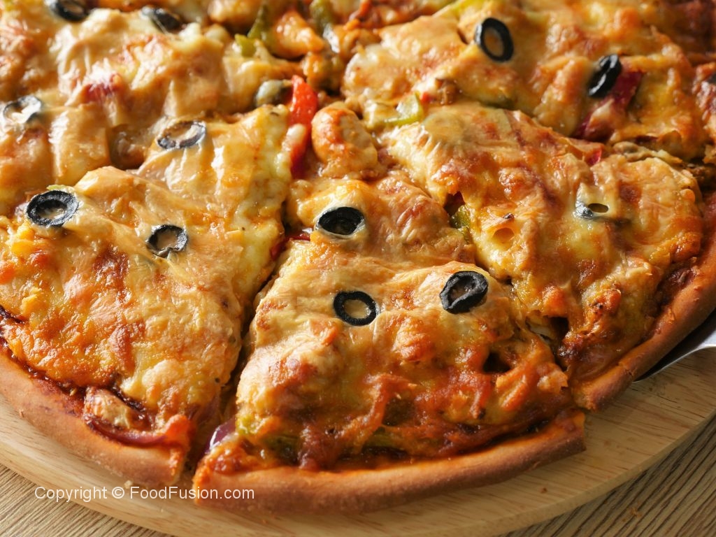 Add and spread pizza sauce,add cooked chicken filling,mozzarella cheese,cheddar cheese and black olives (makes 2 regular pizzas).