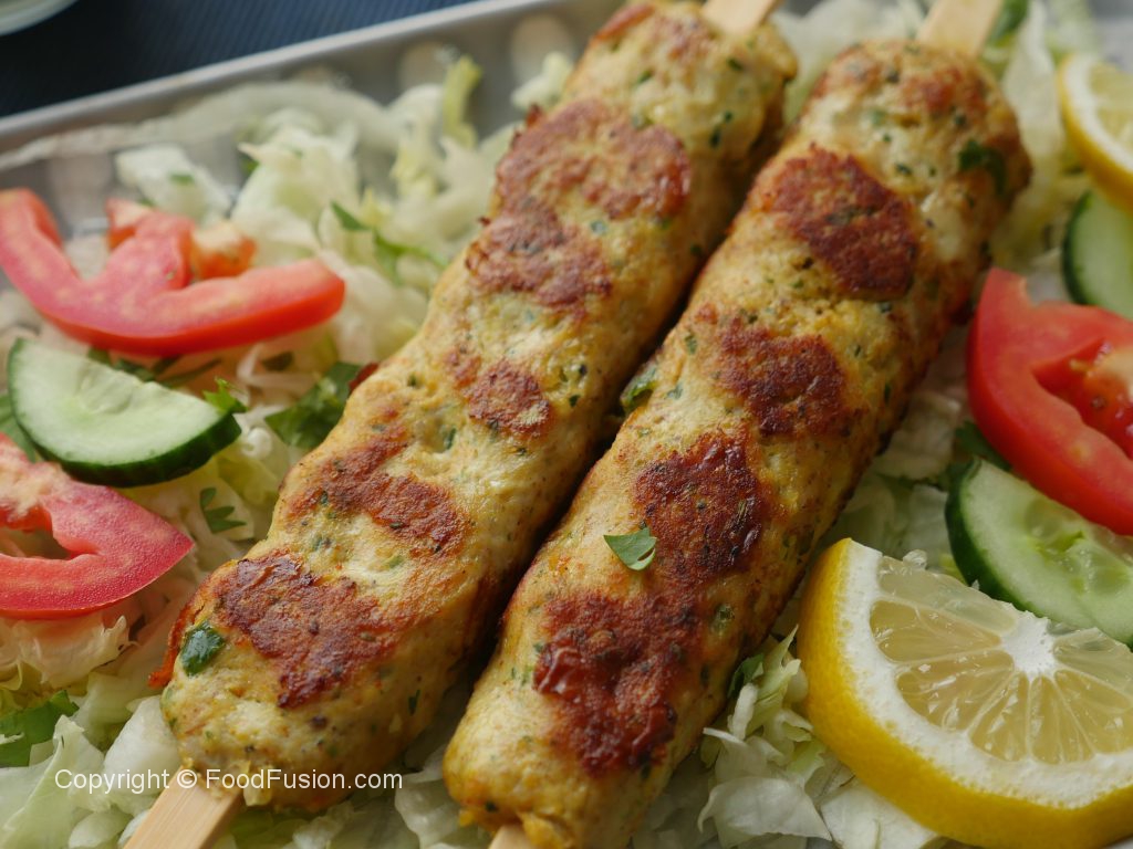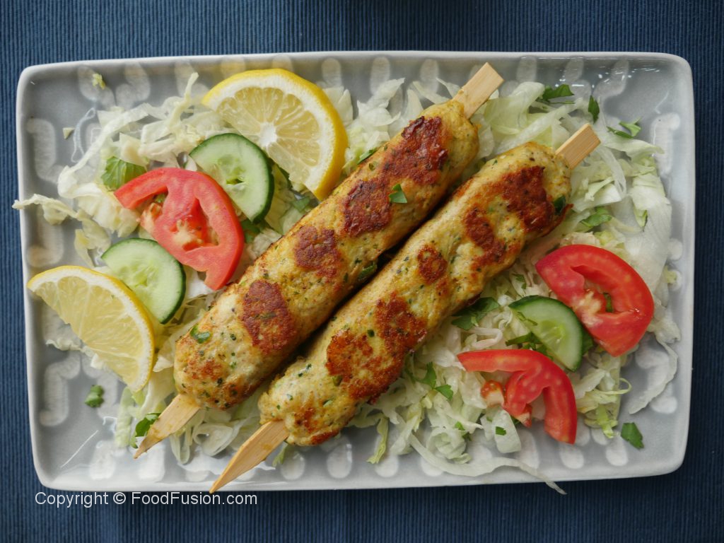 Haathon ko oil sa grease karein,mixture ko lein aur kabab bana ker skewers per laga lein (makes 10-12).