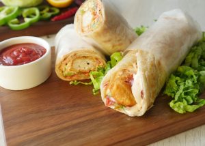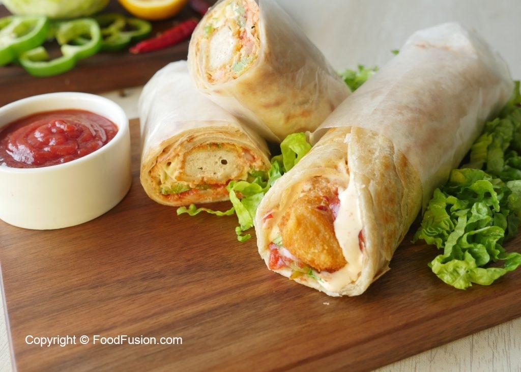Paratha per tomato ketchup,stir fried vegetables,fried chicken nuggets aur tayyar cream & cheese sauce dal dein aur butter paper mein wrap ker ka serve karein!