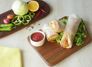 On paratha,drizzle tomato ketchup,stir fried vegetables,fried chicken nuggets and drizzle prepared cream & cheese sauce,warp in butter paper & serve!