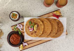 -Heat griddle & fry paratha with clarified butter on medium flame from both sides until golden (makes 9).