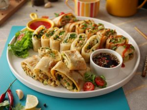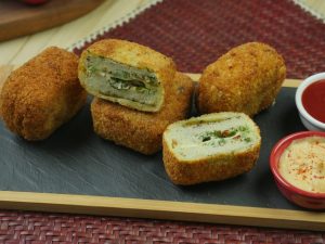 Olper’s cream,cream cheese,namak dal ker mix ker lein,fried chicken aur fried shimla mirch & pyaz dal ker ache tarhan mix ker lein.