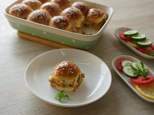 In baking dish,place burger buns,add tomato ketchup,cheddar cheese,cooked chicken mixture,pickled cucumber,onion slices,mozzarella cheese slices and cover with top buns.