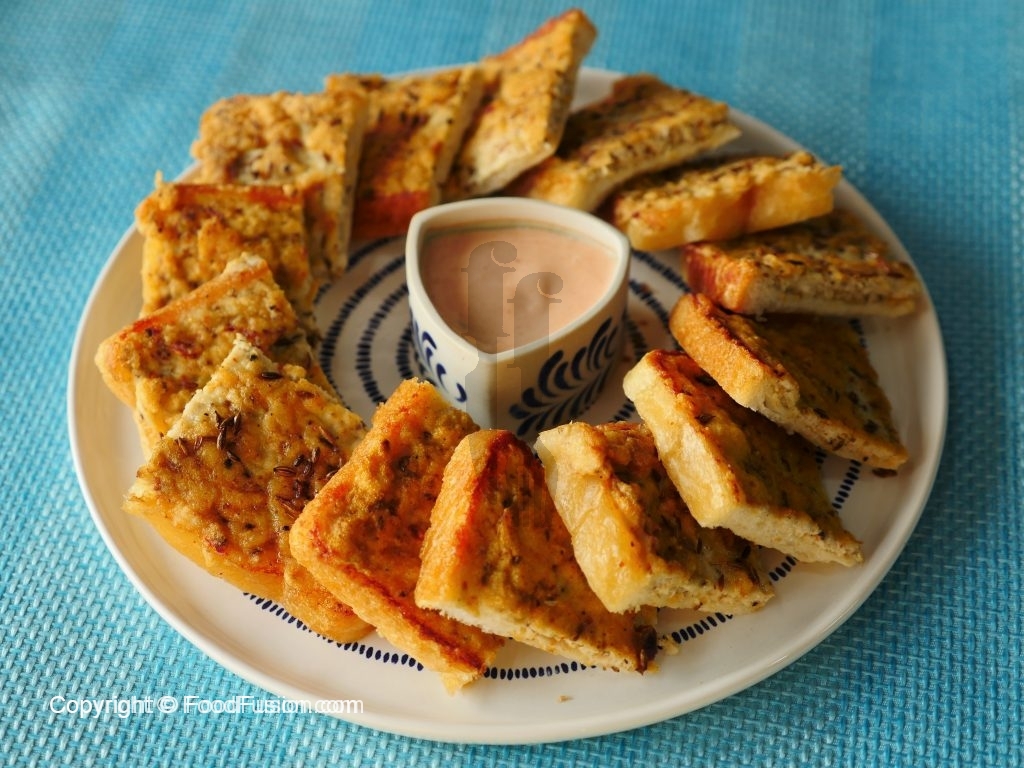 In frying pan, add oil and place bread slices (spread side downwards) and fry for 4-5 minutes on low flame.