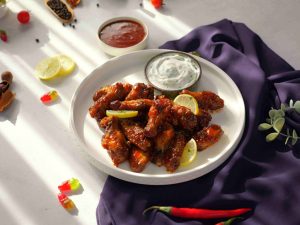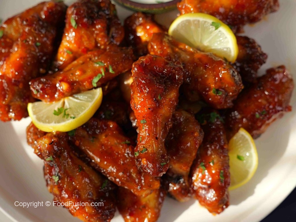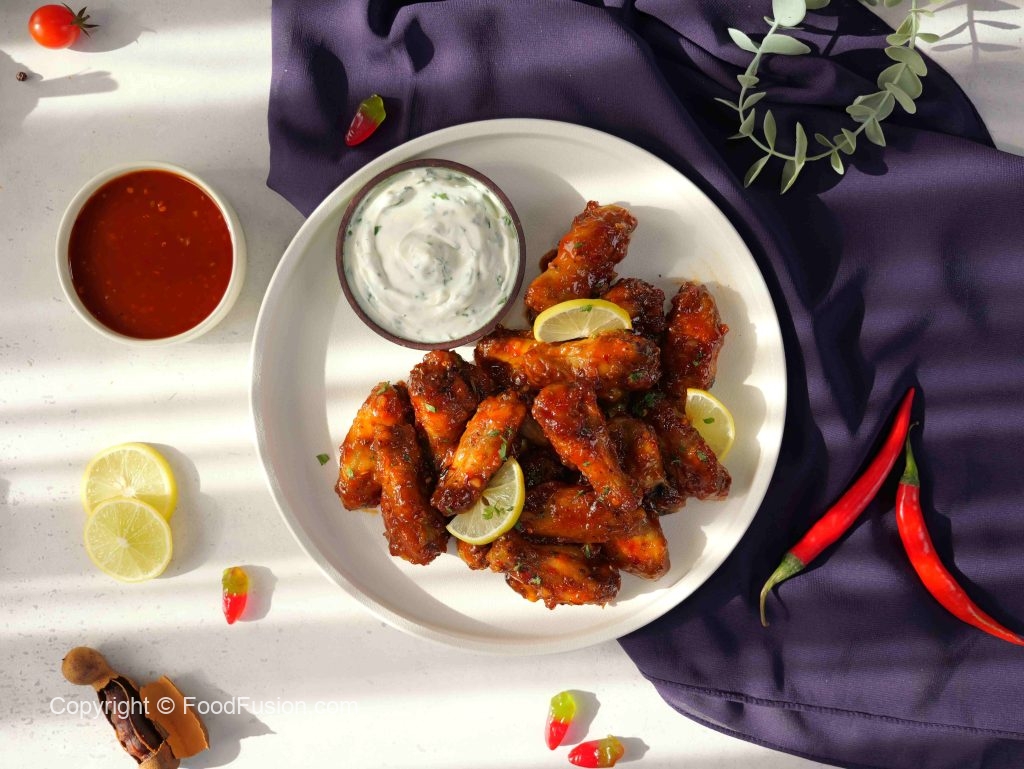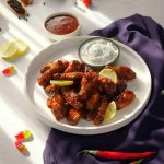 -In a bowl, add air fried chicken wings, pour some prepared chilli milli sauce, coat well.
