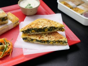 -Add butter,garlic,red chilli crushed,flip the sandwich & cook other side until golden & crispy (makes 4).