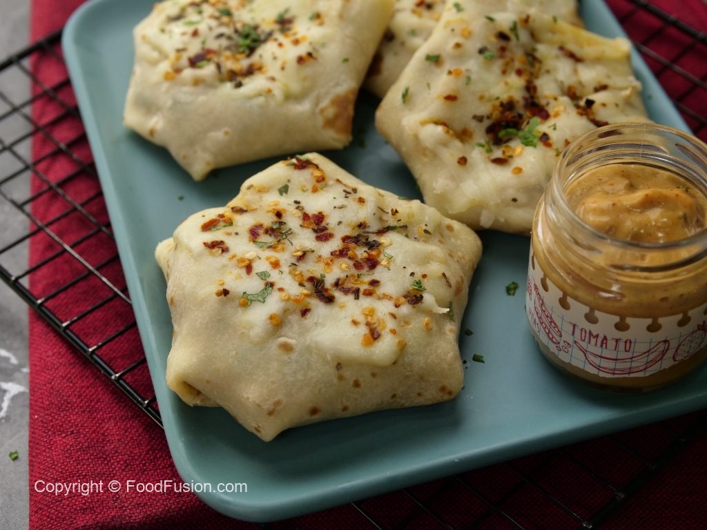 -Grease griddle with cooking oil,place stuffed crepes,sprinkle dried oregano,red chilli crushed,cover & cook on low flame until cheese melts (1-2 minutes).