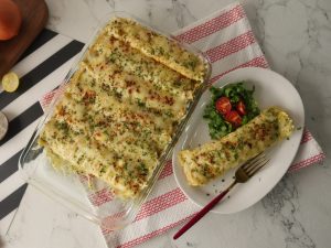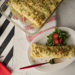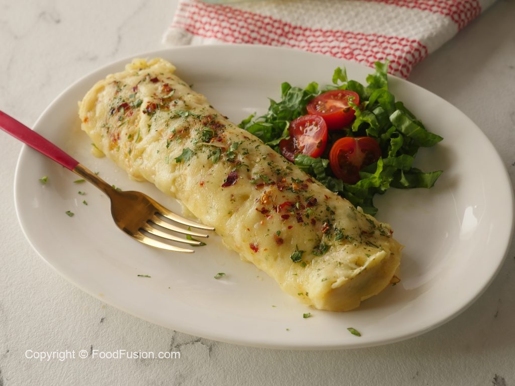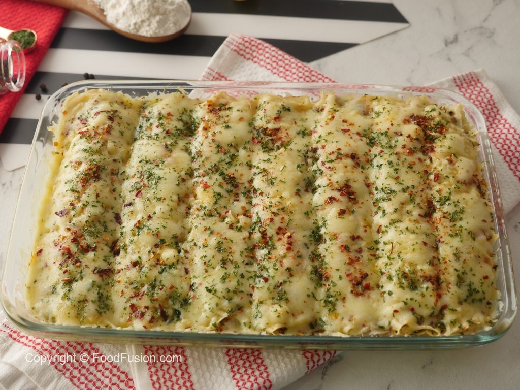 Place stuffed crepe rolls in a baking dish,add cheddar cheese,mozzarella cheese,red chilli crushed & dried parsley.
