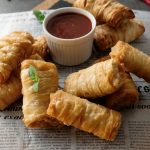 Add prepared creamy chicken filling and apply flour slurry then fold the sides and roll sheet to make samosa (makes 18-20).