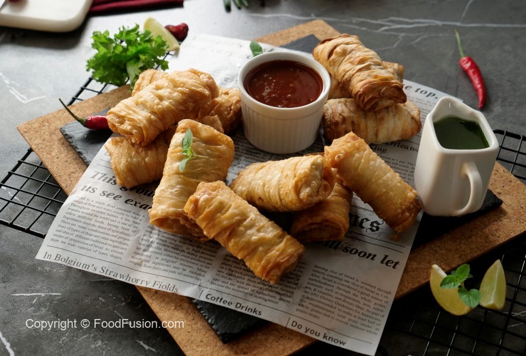 Tayyar creamy chicken filling rakh dein aur flour slurry laga ker sides ko fold ker lein aur sheet ko roll ker ka samosa tayyar ker lein (makes 18-20).