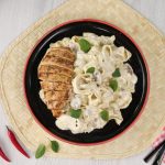 -On a serving plate,add prepared pasta,chicken pieces & garnish with fresh basil leaves.