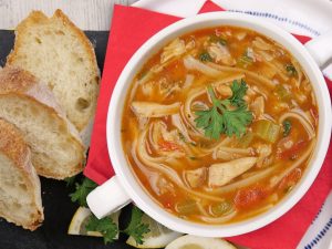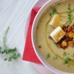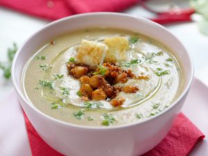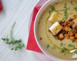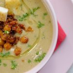 -Garnish with prepared garlicky chickpea topping,fresh parsley,croutons,olive oil & serve hot!