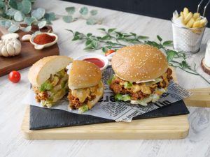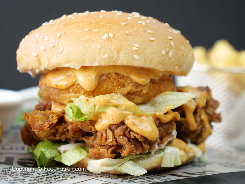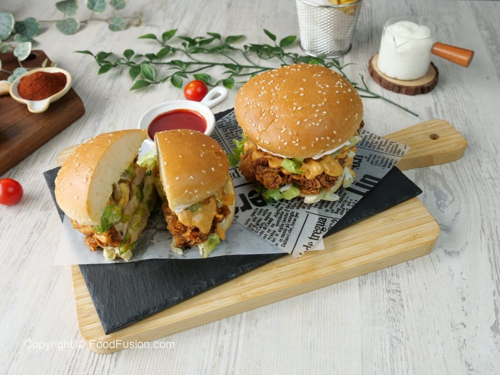 -On burger bun,add & spread mayonnaise,iceberg,crispy fried chicken,prepared spicy mayo sauce ,prepared cheese patty,spicy mayo sauce,iceberg & pickled jalapenos.
