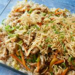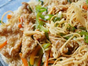 Serving dish mein fried rice,crispy fried chicken with vegetables aur fried egg noodles,hara pyaz ka leaves dal ker serve karein.