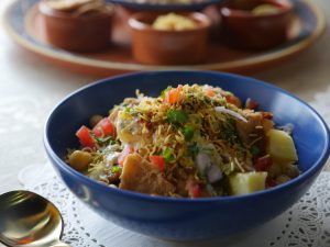 Serving plate mein papri,dumplings,chanay,aloo,tamatar,pyaz,namak,lal mirch crushed,chaat masala, zeera,lemon juice,hari chutney,khajure imli chutney,dahi,chanay,papri,aloo,tamatar,pyaz,sev nimco,dahi,hari chutney,khajure imli chutney,hari chutney,lal mirch crushed,namak,chaat masala aur hara dhania dal ker serve karein.