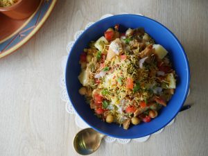 In serving plate,add papri,dumplings,chickpeas,potato,tomato,onion,salt,red chili crushed,chaat masala,cumin seeds,lemon juice,green chutney,date tamarind chutney,yogurt,chickpeas,papri,potato, tomato,onion,sev nimco,yogurt,green chutney,date tamarind chutney,green chutney,red chili crushed, salt,chaat masala,fresh coriander & serve!