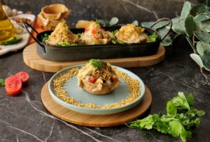Dough pocket mein bhondi,chaat masala,aalo,tamatar,pyaz,spicy hari chutney,imli ki meethi chutney, tayyar dahi,chaat masala,lal mirch powder aur nimxo sev dal ker serve karein!