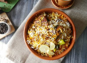 Add dissolve food color and fried onion,cover and steam cook on low flame for 8-10 minutes & serve!