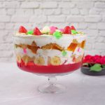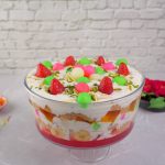 -Make another layer of mix fruits, biscuit crumbs, prepared custard, garnish with colourful sweets, almond, pistachios, strawberries & serve!