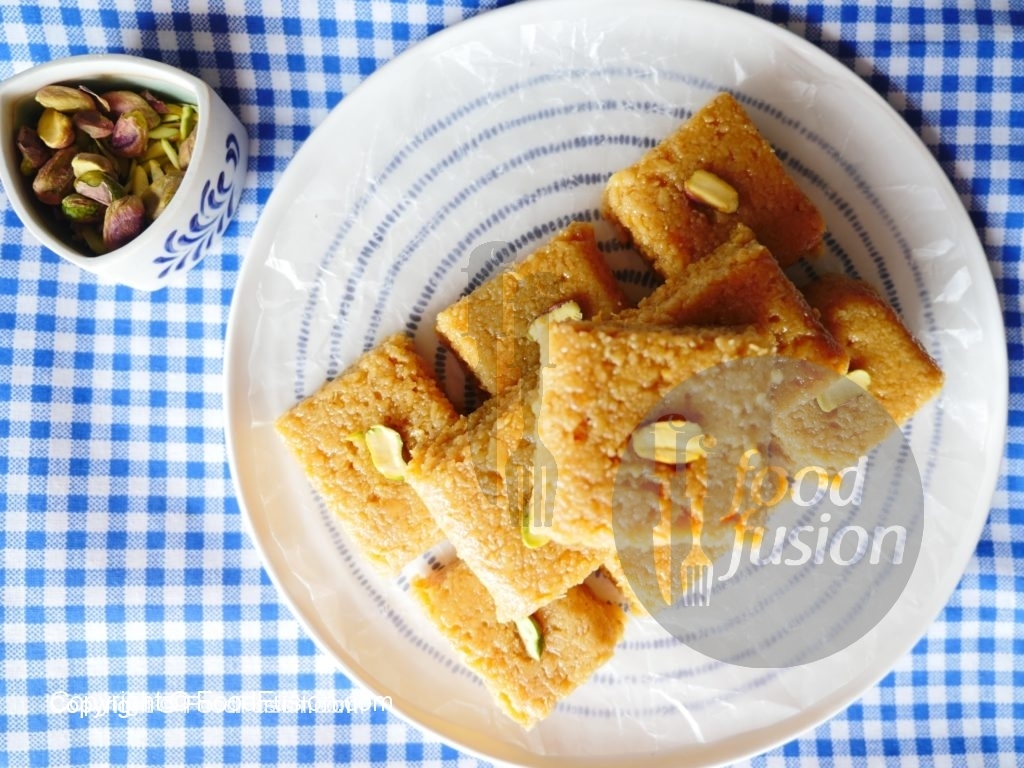 Cut into desired shapes,garnish with pistachios & serve.