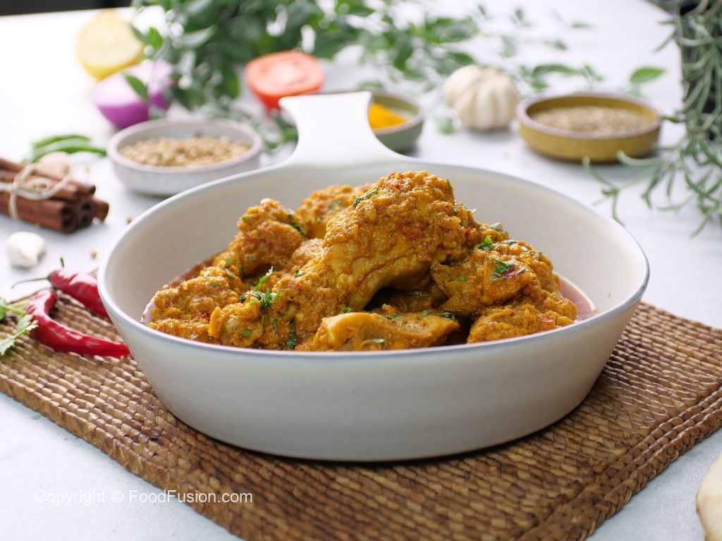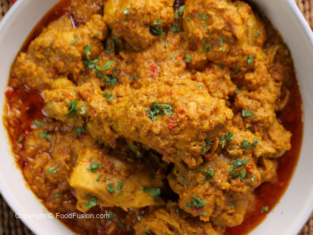 -Mortal & pestle mein pyaz,lehsan,adrak,sukhi lal mirch,khopra aur namak dal ker ache tarhan crush ker ka paste tayyar ker lein & side per rakh dein (spice mill/grinder can also be used).