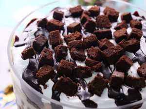 -Add prepared hot fudge sauce,brownie pieces & brush prepared coffee mixture on brownie pieces.
